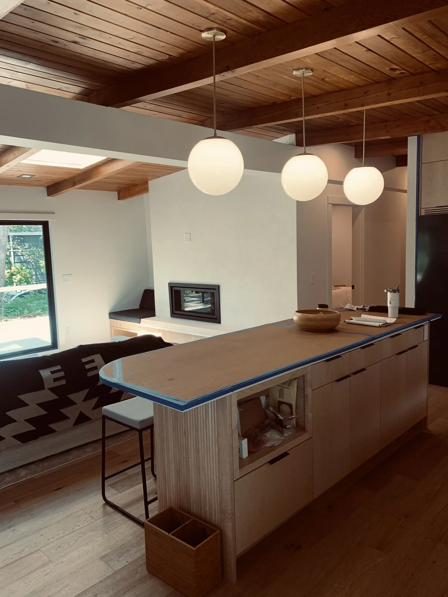 For our “in progress” Manzanita Beach House, the fireplace takes center stage with a soft gray plaster finish and terrazzo counters for the win!