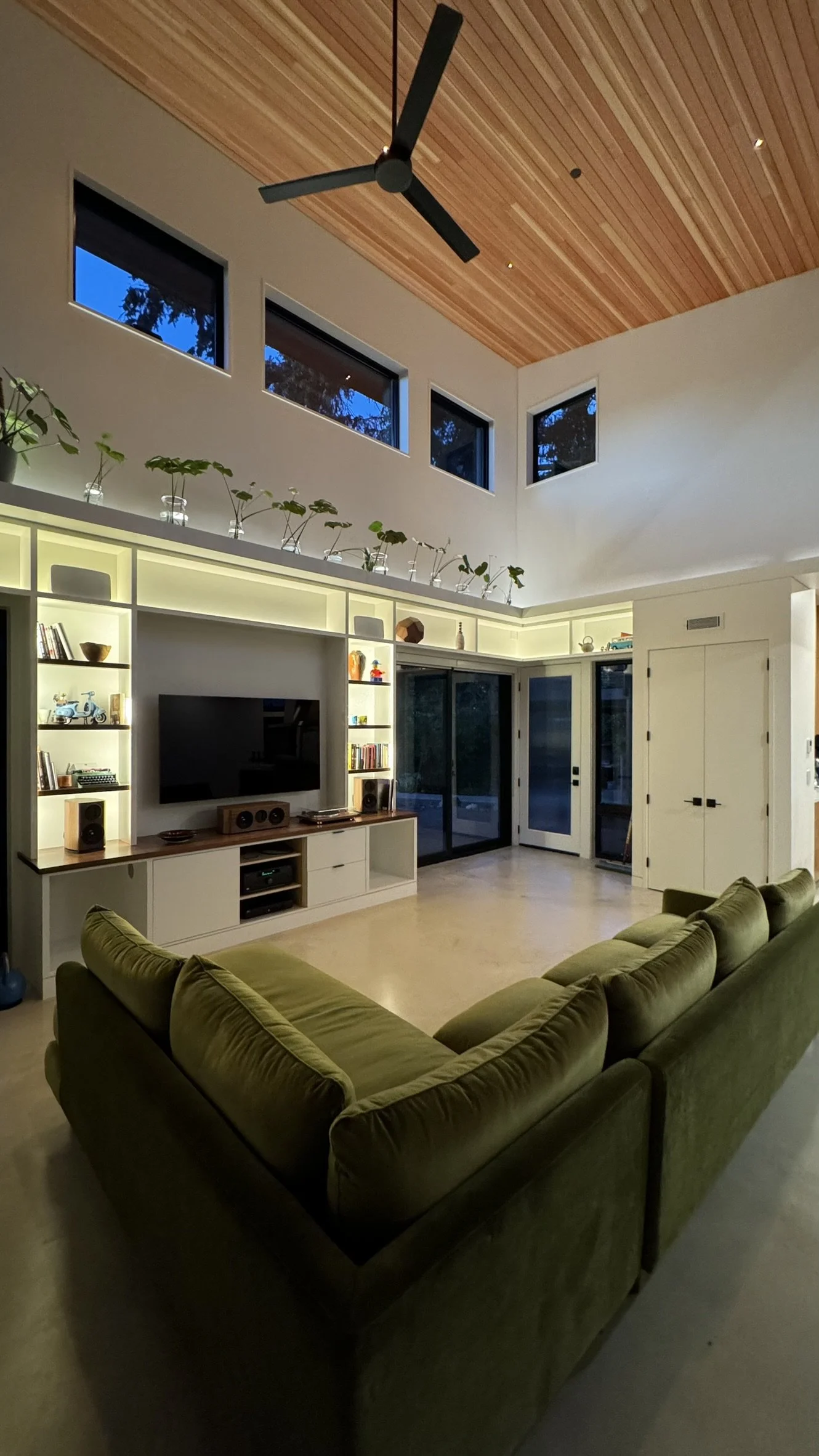 We also played with bold, earthy colors in furniture selections as seen in this olive green sectional. Surrounding the living room space, we’ve designed a plant shelf with a built-in irrigation system below the clerestory windows to create a “living oasis” and bring natural plantlife into the space.